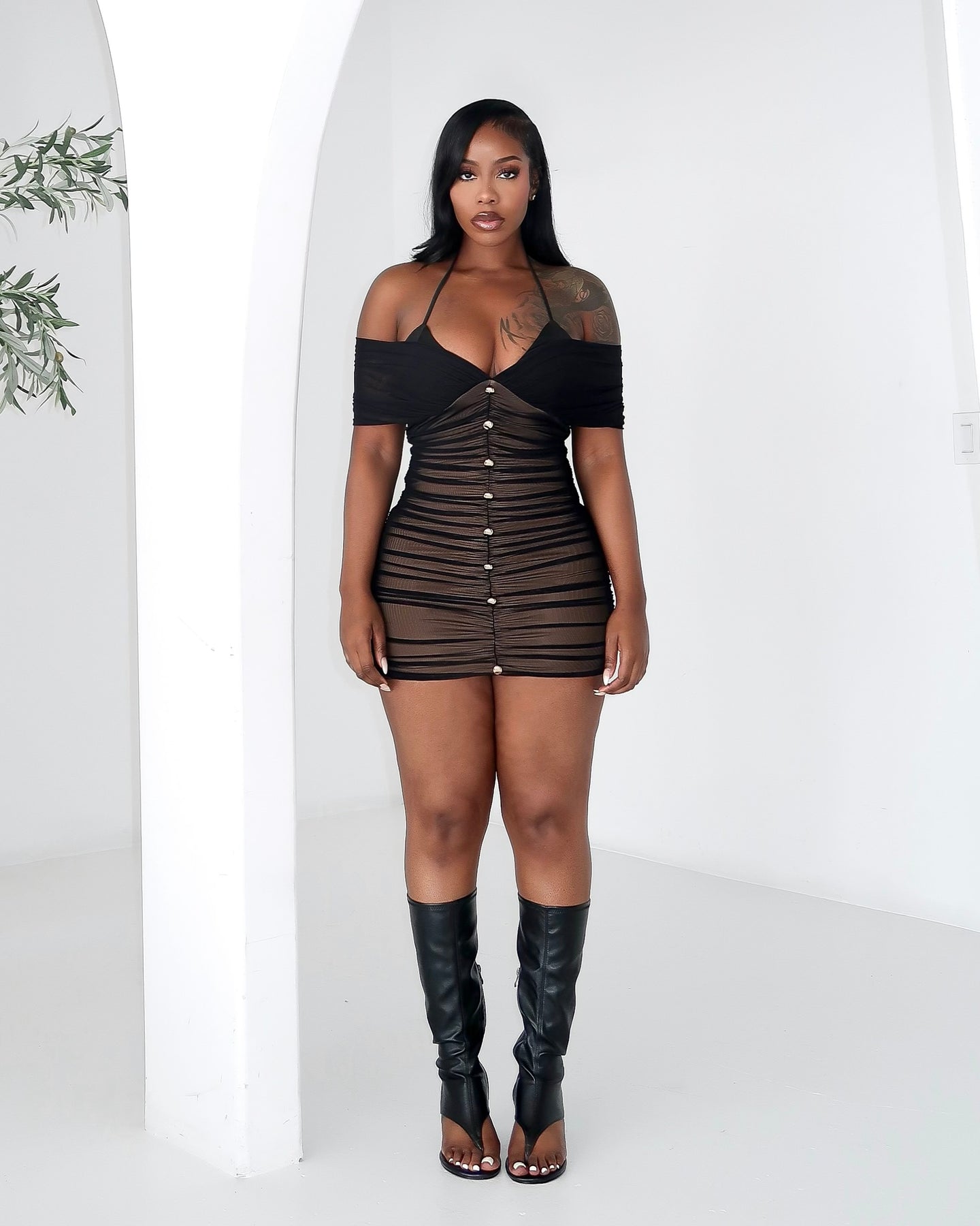 A soft, sculpted mini designed to flatter every curve. Featuring an off the shoulder draped neckline with a halter tie, ruched mesh detailing & a sleek button front finish. Double lined with stretch for a smooth, comfortable fit.